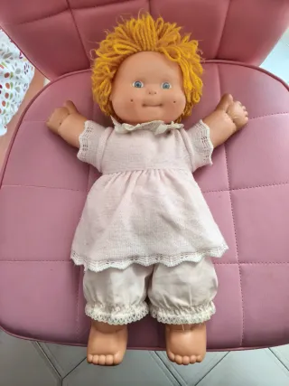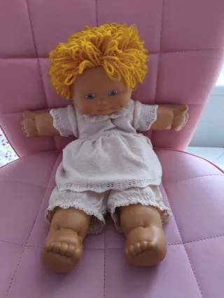 Muñeca de juguete estilo bebé con pelo rubio y detalles en la cara. - Vestido de punto rosa pálido. - Pantalones blancos con encaje. - Brazos y piernas de vinilo.