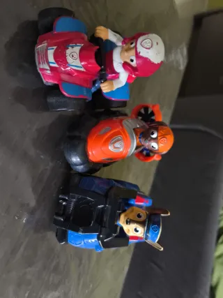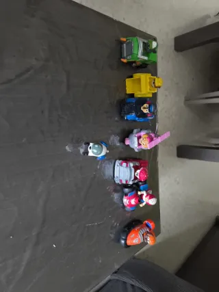 Conjunto de varios juguetes de Paw Patrol, incluyendo vehículos y figuras. - Vehículo verde con detalles. - Vehículo amarillo. - Vehículo azul con figura. - Figura rosa con accesorio. - Figura blanca y azul. - Vehículo rojo con figura. - Vehículo naranja con figura.