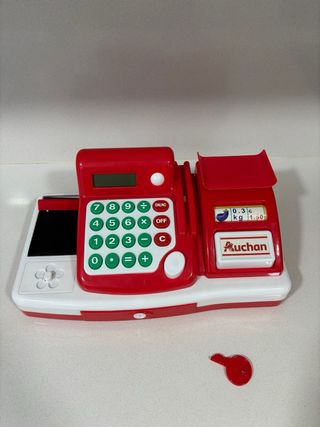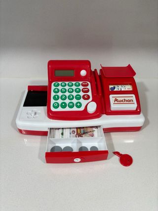 Divertida caja registradora de juguete con accesorios. Tengo el carro de la compra a juego. - Calculadora con teclas numéricas y funciones. - Pantalla LCD. - Cajón extraíble con billetes y monedas de juguete. - Llave roja. - Diseño en color rojo y blanco.