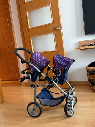 Carro gemelar para muñecas, ideal para jugar. - Diseño con capotas estampadas. - Incluye cesta inferior de malla. - Estructura metálica y ruedas resistentes.