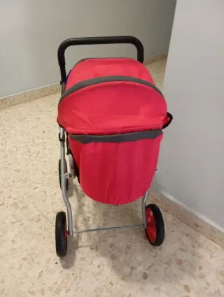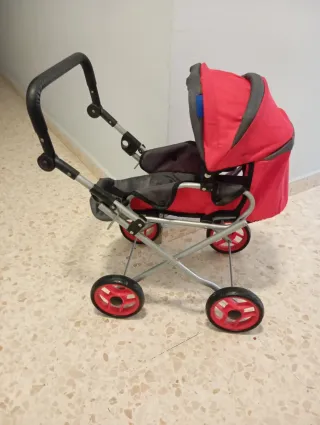 Carrito de juguete para muñecas, ideal para horas de diversión. - Estructura metálica. - Capota y asiento en tela roja y gris. - Ruedas con detalles rojos.