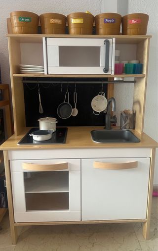 Cocina de juguete de madera de la marca Ikea. Ideal para que los más pequeños desarrollen su imaginación. - Incluye microondas, fregadero y vitrocerámica. - Cuenta con armarios y colgadores con accesorios. - Diseño moderno y funcional.