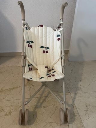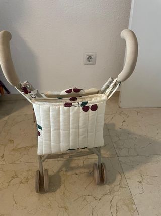 Carrito de juguete para muñecas o peluches, con un divertido estampado de cerezas. - Diseño acolchado. - Cinturón de seguridad. - Ruedas para fácil movilidad.