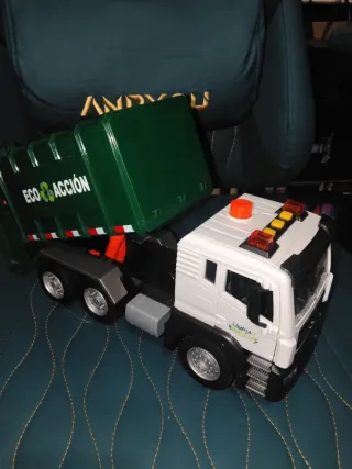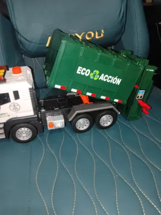 Camión de juguete con temática de reciclaje y limpieza urbana. - Diseño de camión de basura. - Colores verde y blanco. - Detalles de ECO ACCIÓN y LIMPIA Y RECICLA.