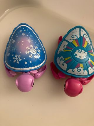 Set de dos juguetes de tortugas flotantes para el baño o piscina. Cada tortuga tiene un diseño único. - Una tortuga con caparazón azul y copos de nieve. - Otra tortuga con caparazón turquesa y diseño de sol y nubes.