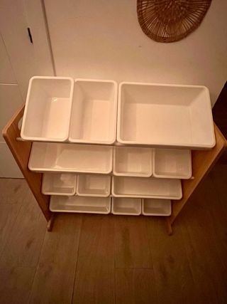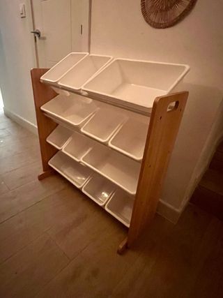 Práctico mueble organizador de juguetes con estructura de madera maciza y cubos de plástico blanco. Montessori *dos de los cubos tienen un leve arañazo q no afecta en absoluto tanto en función como estéticamente. - Incluye 12 cubos de almacenamiento.