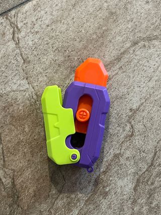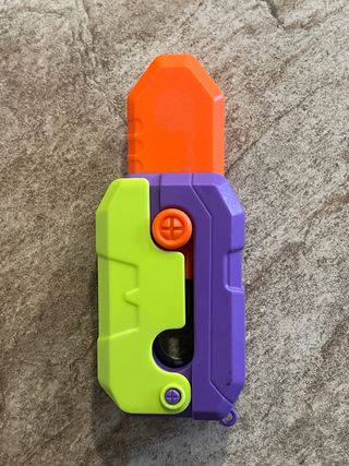 Juguete antiestrés con un diseño divertido y colores llamativos. - Combinación de colores: morado, verde lima y naranja. - Mecanismo con botón circular naranja.