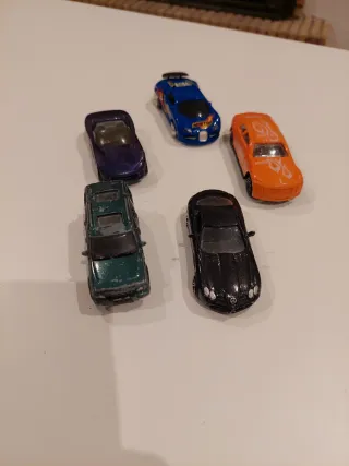 Conjunto de cinco coches de juguete de diferentes colores y modelos. - Coche azul deportivo. - Coche morado descapotable. - Coche naranja con llamas. - Coche verde todoterreno. - Coche negro deportivo. Majorette, guisval, matchbox,lesney, hot wheels
