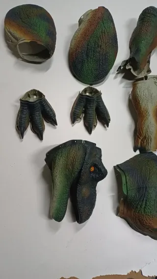 Conjunto de piezas para armar un dinosaurio con diseño de camuflaje. - Diseño texturizado. - Colores verde, marrón y negro. Son partes de un casco de dinosaurio grande.