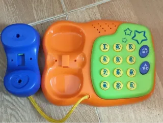 Teléfono de juguete de la marca Nennittos, con un diseño colorido y divertido. Juguettos. - Base naranja. - Auricular azul con estrellas. - Teclado numérico verde con botones amarillos. - Botones de función azul. - Cuerda amarilla.