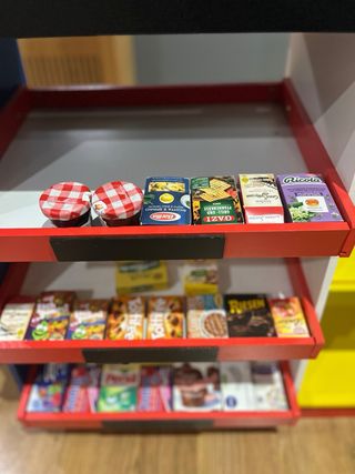 Divertida tienda de Lidl para jugar a las compras. Incluye los accesorios que venían con la tienda ( se muestran en la última foto ) - Diseño colorido y atractivo. - Estanterías para colocar productos. - Incluye cesta de la compra. - Pantalla táctil simulada.