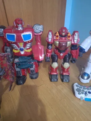 Conjunto de juguetes de robots y mandos de videojuegos. - Robot gris y rojo con alas. - Robot negro y rojo con alas. - Robot rojo grande. - Robot azul pequeño. - Dos mandos de consola blancos.