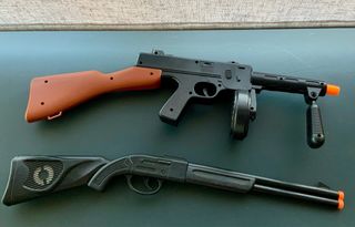 Se venden dos escopetas de juguete, una con culata marrón y otra completamente negra. - Escopeta estilo Thompson con cargador redondo. - Escopeta de corredera negra. Son de plástico y están nuevas.