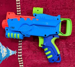 Pistola de juguete de la marca Nerf con un diseño llamativo en colores azul, naranja y verde. - Cuerpo principal en azul. - Detalles en naranja en la parte frontal. - Empuñadura y detalles inferiores en verde y azul. - 37 cm larga.