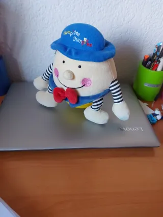 Adorable tente tieso Humpty Dumpty con su característico sombrero azul. - Diseño basado en la popular canción infantil. - Detalles bordados en el sombrero y la cara. - Ropa de payaso con pajarita roja.