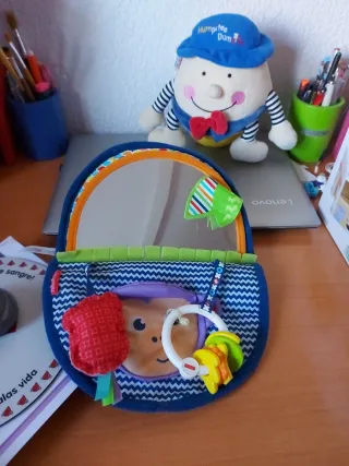 En perfecto estado, muy poco uso. Suena bien. Juguete musical para bebés con forma de pajarito. - Diseño de peluche amarillo con alas coloridas. - Incluye sonajeros y botones interactivos. - Adornado con un collar de lunares negros y blancos.