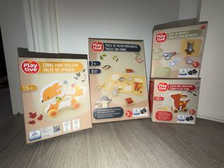 Conjunto de cuatro juguetes de madera de la marca Play Tive. - Zorro para deslizar. - Puzzle de animales en madera. - Ciervo para arrastrar. - puzzle de piezas encajables.
