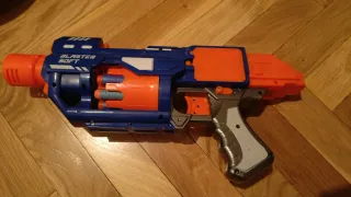 Pistola de juguete de la marca Blaster Soft, con un diseño llamativo en colores azul y naranja. - Tambor giratorio. - Empuñadura ergonómica.