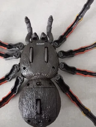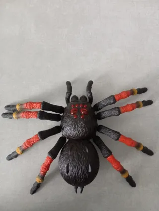 Juguete de araña grande con diseño de tarántula. Se puede activar/desactivar el movimiento que simula el movimiento real de la araña (incluidas las pilas). - Cuerpo negro peludo. - Patas segmentadas en negro, rojo y amarillo. - Detalles rojos en el cefalotórax.