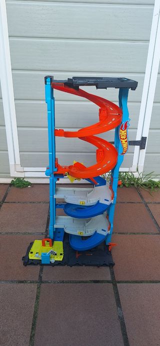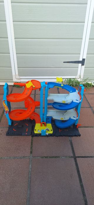 Pista de carreras Hot Wheels con múltiples niveles y rampas. Se habre y se convierte en doble pista. Con ascensor. - Diseño vertical con espiral. - Ascensor - Regalo 2 coches.