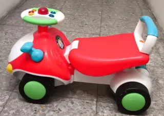Correpasillos de juguete con diseño divertido. - Volante interactivo con botones. - Asiento rojo. - Ruedas verdes y negras. - Empuñadura azul para empujar.