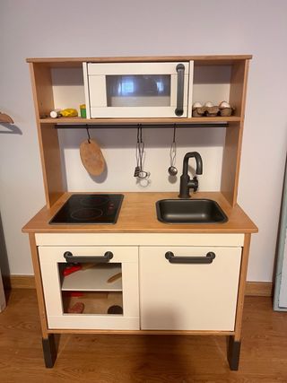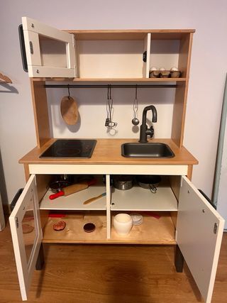 El fuego no funciona, desconozco si será problema de pilas o que está roto y no se ilumina. - Incluye horno/microondas, fregadero y fogones. - Puertas abatibles. - Colgador para utensilios. - Accesorios de cocina de madera.