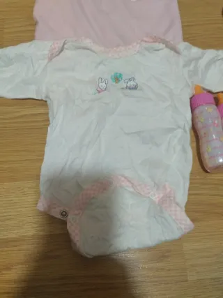 Conjunto de ropa y accesorios para muñeco bebé. - Pelele rosa con cuello blanco y pele blanco. - Babero amarillo con dibujo de biberón y babero rosa y blanco. - Dos biberones pequeños con detalles brillantes.