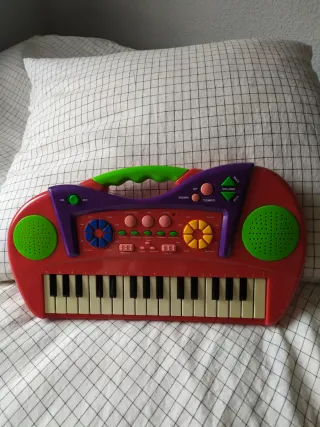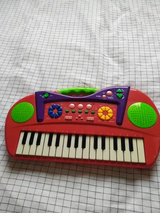 Piano de juguete de color rojo con teclas blancas y negras. Incluye altavoces verdes a los lados y un asa para transportarlo. Funciona con tres pilas AA no incluidas - Teclado de 37 teclas. - Botones de control de volumen y tempo. - Altavoces integrados.