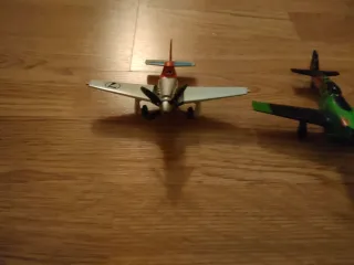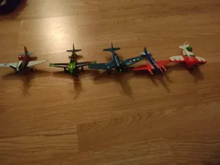 Conjunto de cinco aviones de juguete, de 11 cm de largo cada uno. - Avión plateado con detalles rojos y blancos. - Avión verde con detalles negros. - Avión azul oscuro con estrellas blancas. - Avión rojo con detalles azules y blancos. - Avión blanco con detalles rojos y verdes.