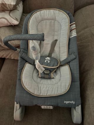 Hamaca vibratoria para bebé de la marca Ingenuity. Diseñada para ofrecer comodidad y entretenimiento. y música relajante Cuenta con tecnología de masaje patentada para aliviar el malestar del bebé. El asiento profundo y oscilante está diseñado para mayor comodidad. Es adecuada para bebés desde recién nacidos (0 meses) hasta los 9 kg - Diseño acolchado con estampado de rayas. - Barra de juguetes. - Arnés de seguridad de 3 puntos. - Patas antideslizantes. usada solo una vez