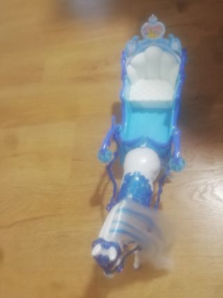 Carroza de juguete de color azul y blanco, con detalles brillantes y adornos. - Diseño inspirado en cuentos de hadas. - Ruedas móviles. - Incluye un caballo blanco con crin y cola azules. - sin caja. Prefiero venta en mano en Vigo, pero puedo hacer envíos. Cualquier duda pregunta sin compromiso.