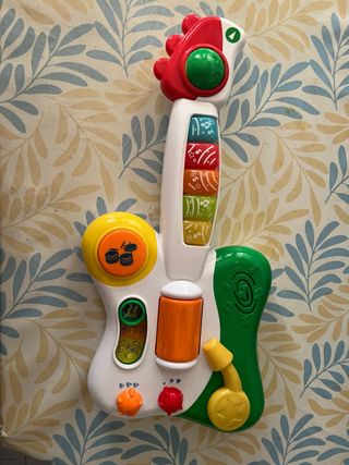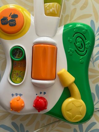 Guitarra de juguete interactiva con luces y sonidos. - Diseño colorido con forma de guitarra. - Botones con diferentes melodías y efectos. - Incluye tambores y otros elementos musicales.
