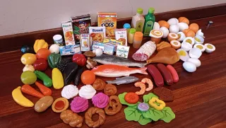 Set de juguetes de cocina con variedad de alimentos de plástico. - Incluye frutas, verduras, pescados, carnes, pan y dulces. - Incluye réplicas de envases y bricks. - Incluye algunas piezas de madera, como huevos cocidos o botellas de aceite y vinagre.
