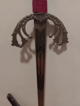 Set de espada y pistola decorativas, ideales para coleccionistas o como atrezo. La espada entera mide 74cm, sin contar el mango 60cm - Espada con empuñadura roja y detalles plateados. De juguete - Pistola antigua de juguete con grabados.