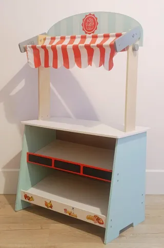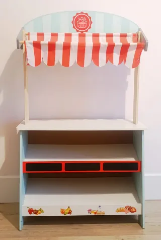 Puesto de mercado por un lado y teatro de juguete para marionetas por el otro. - Estructura de madera con toldo a rayas rojas y blancas. - Telón que sube y baja con una rueda lateral. - Estantes para exponer productos. - Pizarras para escribir precios o nombres. - Adornos de frutas, pan y lácteos en la base. Dimensiones: Altura total: 100 cm. Altura del mostrador: 46 cm. Ancho: 60 cm. Profundidad: 35 cm.