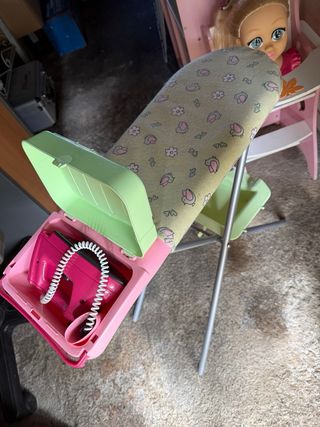 Trina de color rosa con un diseño encantador con muñeca,Ideal para jugar. Tabla de planchar con plancha...maquina de coser