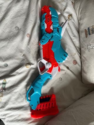 Pistola de juguete Nerf Dinosquad con diseño inspirado en dinosaurios. - Colores rojo y azul.