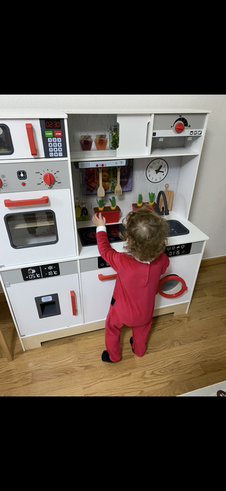 Divertida cocina de juguete fabricada en madera, ideal para que los más pequeños desarrollen su imaginación. - Incluye accesorios como platos, cubiertos y utensilios. Algunas comidas, kit de hacer crepes y pasta. - Cuenta con horno, vitrocerámica y fregadero. - Diseño colorido y atractivo. Regalo repetido navidades. Jugo con ella un dia.
