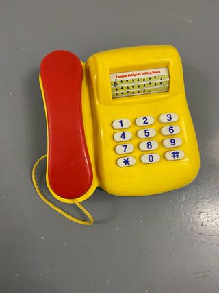 Teléfono de juguete de color amarillo brillante, con un auricular rojo. - Incluye una pantalla con notas musicales y la canción London Bridge Is Falling Down. - Teclado numérico con los números del 0 al 9, asterisco y almohadilla.