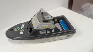 Lancha de policía de juguete, modelo de 1984. Ideal para coleccionistas o para jugar. - Diseño detallado de lancha policial. - Color gris y negro con detalles amarillos y azules. - Inscripciones POLICE y número 4 visibles.con todo lo de la foto