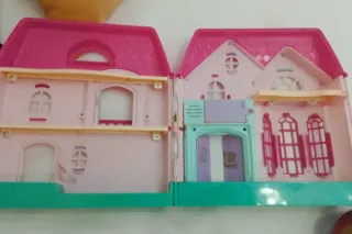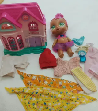 Lote de juguetes que incluye una casa de muñecas y varios accesorios. - Casa de muñecas rosa., llevaba timbre y en esa zona tiene un poco de oxido pero aún es aprovechable - Muñeca como nueva - Ropa variada de otras muñecas