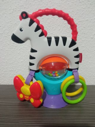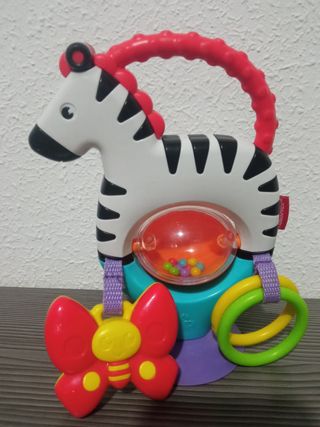Caballo con sonajero, mariposa que hace ruido y anillas. Tiene ventosa para pesarla en cualquier lugar mesa, bañera...