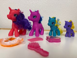 Conjunto de cuatro figuras de unicornios de juguete con accesorios. - Unicornio rosa con melena morada. - Unicornio fucsia con melena azul. - Unicornio azul con melena amarilla y lazo. - Unicornio morado con melena amarilla. - Incluye peine, cepillo y un pequeño estuche. Otros unicornios de menor calidad con accesorios de regalo