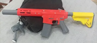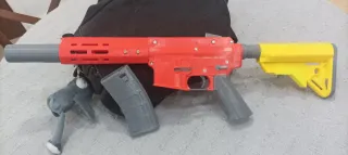 Réplica de arma de juguete con diseño llamativo en color rojo, gris y amarillo. Dispara gomas y se cargan en la parte superior. - Fabricada en plástico resistente. - Incluye cargador extraíble. - Culata ajustable -Soporte de pared adaptado
