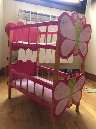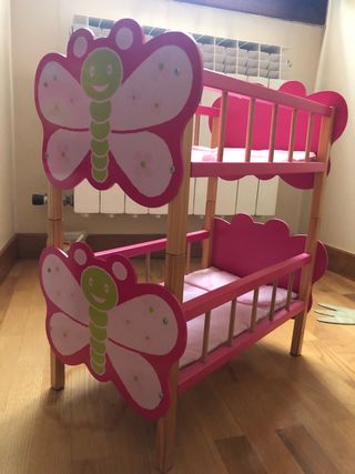Cuna gemelar de madera para muñecas, con un bonito diseño de mariposas. - Estructura de madera. - Dos camas. - Decoración de mariposas rosas.
