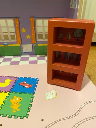 Casa de juguete de madera inspirada en Peppa Pig. Ideal para horas de diversión. - Incluye accesorios como un tren de juguete y un pequeño librero. - Decorada con motivos infantiles como animales y estrellas. - Diseño de dos plantas con ventanas y cortinas.