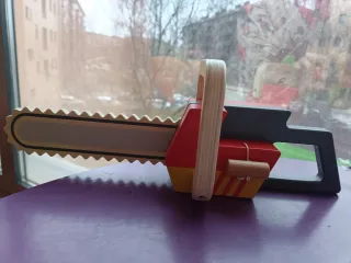 Motosierra de juguete de madera de la marca Small Foot. - Diseño colorido con detalles en rojo, amarillo y gris. - Empuñadura de madera. - Hoja de sierra con dientes decorativos. - Hace ruido al tirar de la cuerda. - Está como nueva.