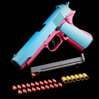 Pistola de juguete con retroceso. Material plástico. Dispara bolitas de goma semidura. No hacen daño. Alcance de 10 metros Totalmente nueva a estrenar.