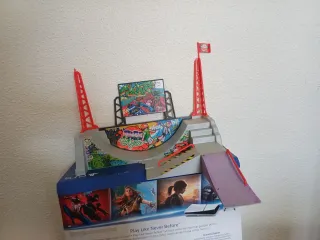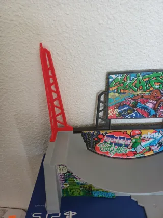 Pista de patinaje de juguete con diseño inspirado en el graffiti y temática de juegos. - Incluye rampas y torres. - Bandera decorativa en la parte superior. - Base con imágenes de videojuegos.