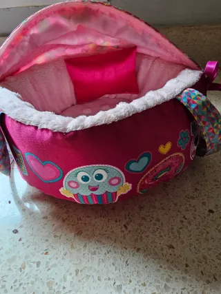Adorable cuna de peluche para muñecas, con un diseño divertido y colorido. - Interior suave y acolchado. - Incluye una pequeña almohada. - Decorada con simpáticos personajes y formas. - Asas para facilitar su transporte.